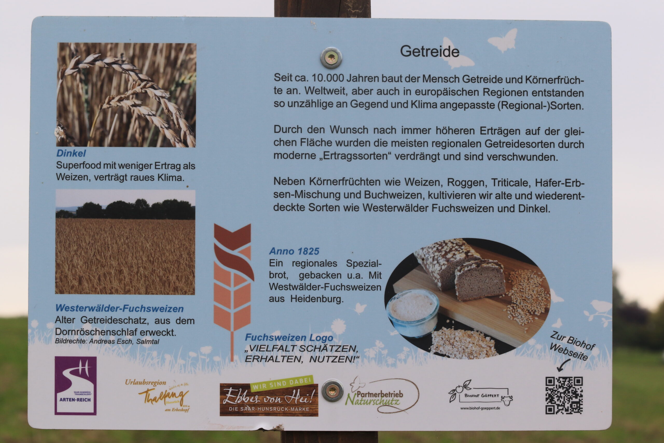 Am Feldrand erklärt eine Infotafel „Getreide“ regionale Sorten wie Dinkel und Westerwälder Fuchsweizen, verweist auf traditionelles Brot und die Bedeutung kleinteiliger Landwirtschaft. Ein kurzer Wissensstopp, der zeigt, wie eng Landschaftsbild und Ernährung verbunden sind.